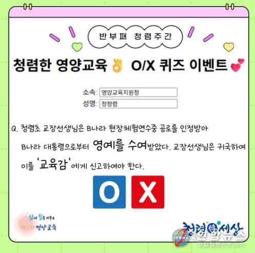 ‘청렴 O/X 퀴즈 이벤트’에 참여한 관내 초등학교 소속 한 교직원은 “평소 뉴스나 신문에서만 보던 법령을 교육환경에 적용하여 이해하기 쉽게 문제로 접할 수 있어 업무 수행에 큰 도움이 될 것 같다”라고 참여 소감을 밝혔다