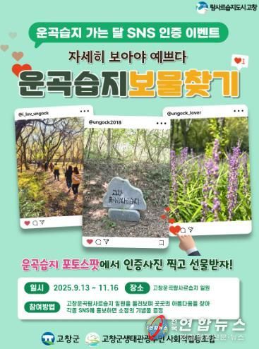 전국연합뉴스 김현호 기자 | 고창군은 올가을 운곡람사르습지를 방문하는 탐방객들을 위한 SNS 인증 이벤트 ‘운곡습지 보물찾기’를 운영한다.