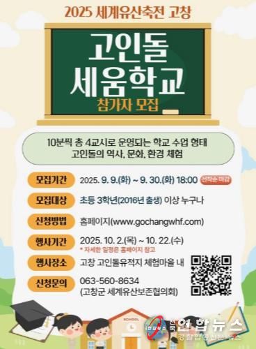 전국연합뉴스 김현호 기자 | 고창군 세계유산보존협의회가 오는 10월 ‘2025 세계유산축전 고창 고인돌·갯벌’의 개최를 앞두고, 축전의 대표 체험 프로그램 6개에 대한 사전예약 접수를 9월30일까지 진행한다고 밝혔다.