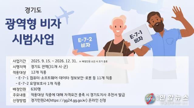 전국연합뉴스 조민준 기자 | 경기도가 IT, 돌봄 등 외국인 전문인력 유치를 위한 경기도 맞춤형 비자 제도를 도입한다. 도는 15일부터 ‘경기도 광역형 비자 시범사업’을 시행해 기업의 인력난 해소와 외국인의 안정적인 지역 정착을 지원한다고 밝혔다.