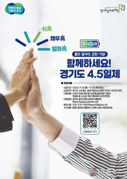 전국연합뉴스 조민준 기자 | 경기도와 경기도일자리재단은 노동자의 일·생활 균형과 노동환경 개선을 통한 생산성 향상을 위해 15일부터 30일까지 ‘2025년 경기도 4.5일제 시범사업’ 참여 기업 3차 추가 모집을 한다.