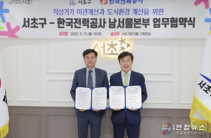 전국연합뉴스 김태연 기자 | 서울 서초구가 15일 서초구청에서 한국전력 남서울본부와 ‘지상기기 미관 개선과 도시환경 개선을 위한 업무협약’을 체결했다고 밝혔다. 이번 협약은 두 기관이 상호 협력하여 서초구 공공보도상 지상기기 정비를 통해 도시환경을 개선하고 쾌적한 보행환경을 만들기 위해 추진됐다.