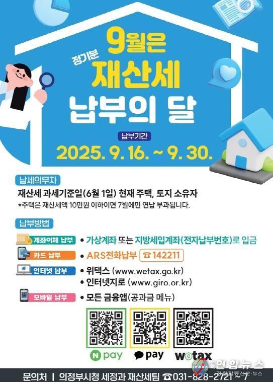 전국연합뉴스 박점규 기자 | 의정부시는 2025년 9월 정기분 재산세(주택, 토지) 16만4천728건, 총 458억 원을 부과하고 납세자에게 고지서를 발송했다.