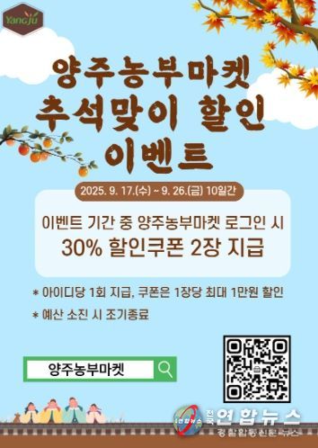 이번 특별 할인 이벤트는 오는 9월 17일부터 9월 26일까지 진행되고, 이벤트 기간 동안 양주농부마켓 로그인 시 30% 할인쿠폰 2장이 지급되어 바로 사용 가능하며, 예산 소진 시 조기 종료될 수 있다.