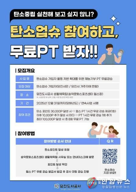 전국연합뉴스 김용태 기자 | 당진도시공사 생활체육팀은 탄소중립 실천을 생활 속에서 확산하고, 지역민의 건강 증진을 지원하기 위해 탄소업슈 가입자를 대상으로한 ‘재능기부 PT 무료 강습 프로그램을 운영한다고 밝혔다.