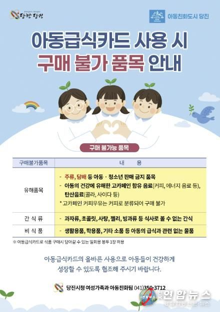 전국연합뉴스 김용태 기자 | 당진시는 아동급식카드(꿈자람카드)의 투명하고 원활한 운영을 위해 아동급식카드 대상자 589명, 관내 아동급식 가맹점(마트) 40개소에 ‘아동급식카드 사용 시 구매 불가 품목 안내문’을 배포했다고 17일 밝혔다.
