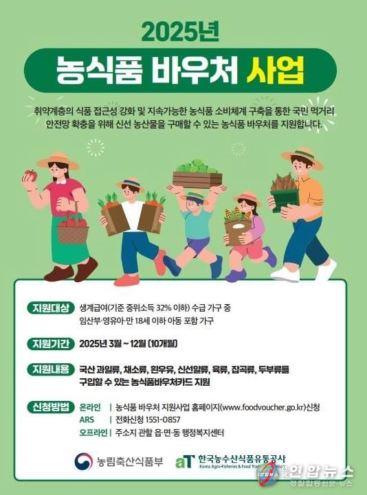 올해 3월부터 지급돼 12월까지 지원되며, 가구원 수에 따라 월 4만 원(1인 가구)부터 18만 7천 원(10인 이상 가구)까지 차등 지급된다. 수혜자는 지정된 판매점에서 쌀, 채소, 과일, 계란 등 국내산 신선농산물을 구입할 수 있다.