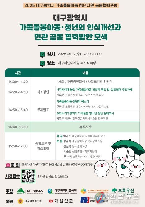 전국연합뉴스 기자 | 대구시교육청은 9월 17일 오후 2시, 대구어린이세상 꾀꼬리극장에서 가족돌봄아동·청년지원 공동협력포럼을 개최한다.