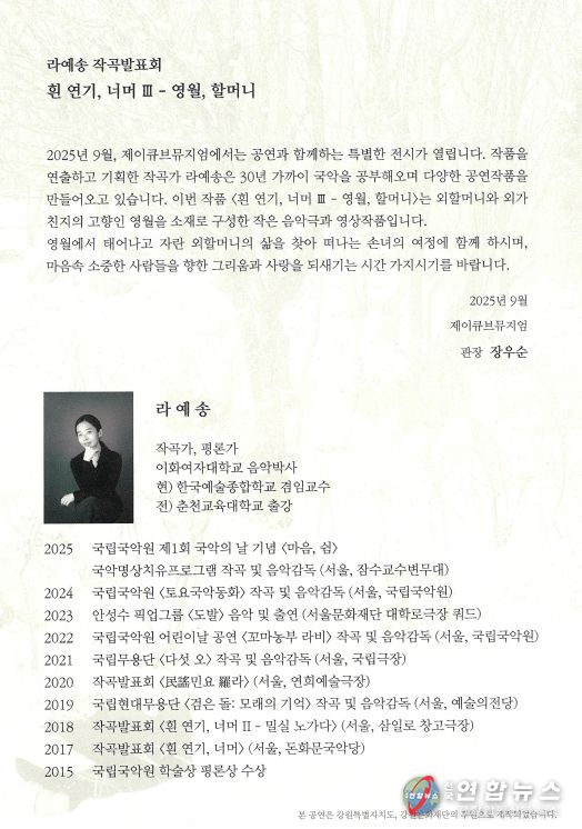 오는 9월에는 초대전 [흰 연기, 너머Ⅲ-영월, 할머니]와 함께 ‘라예송 작곡발표회’가 제이큐브뮤지엄에서 열린다.