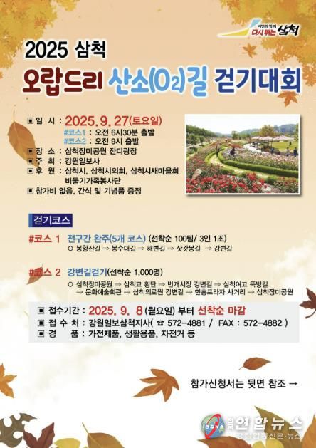 전국연합뉴스 권찬규 기자 | 삼척시는 오는 9월 27일 삼척장미공원 잔디광장에서 '2025년 삼척 오랍드리 산소길 걷기대회'를 개최한다.