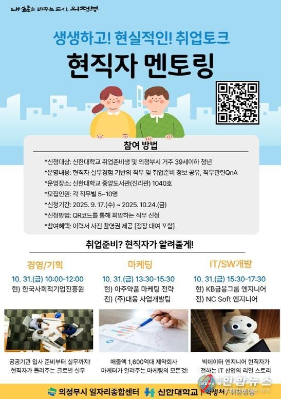 전국연합뉴스 박점규 기자 | 의정부시는 청년들의 취업목표 설정과 진로 탐색을 지원하기 위해 ‘현직자와 함께하는 맞춤형 취업멘토링’을 운영한다.