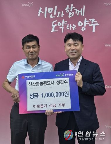 전국연합뉴스 박점규 기자 | 양주시 남면 신산흥농 종묘사가 지난 17일 남면 행정복지센터를 방문해 이웃돕기 성금 100만원을 전달했다.