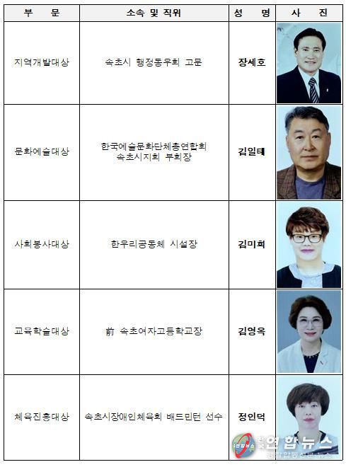 △ 지역개발대상에는 장세호 속초시 행정동우회 고문이 선정됐다. 35년간의 공직생활과 시민사회 활동으로 지역공동체 발전에 헌신해 왔다.