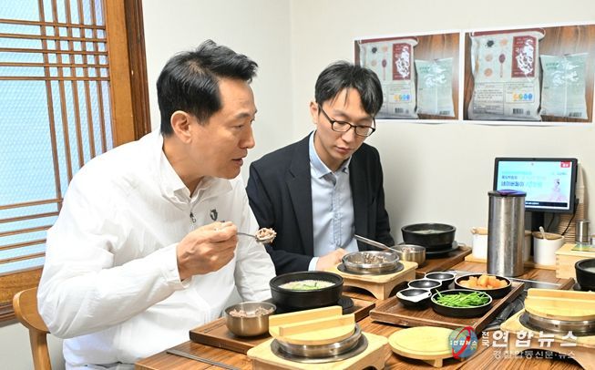 전국연합뉴스 김태연 기자 | 오세훈 서울시장이 19일 오후 12시, 중구 소재 한 식당에서 정희원 서울건강총괄관과 외식이나 배달시에도 흰쌀밥 대신 통곡물‧잡곡밥을 선택할 수 있는 ‘통쾌한 한끼’ 추진 전략을 논의했다.