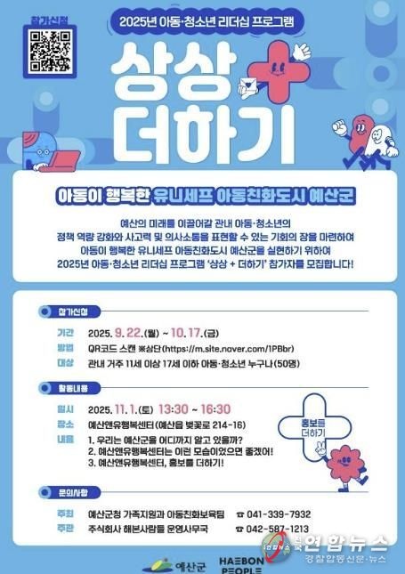 ‘상상+더하기 아동·청소년 리더십 프로그램’은 11월 1일 오후 1시 30분, 예산앤유행복센터에서 열릴 예정이며, 참가자들은 아동친화도시에 대한 이해를 바탕으로 아이디어 발굴, 정책 제안 등 다양한 참여형 활동에 참여할 예정이다.