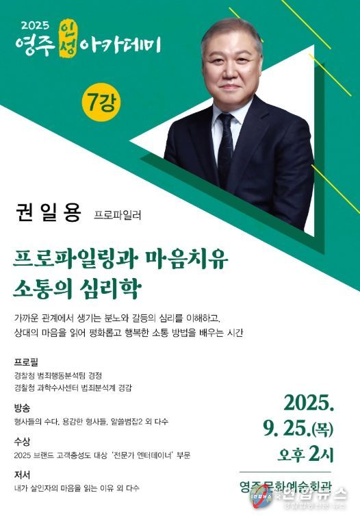 전국연합뉴스 김삿갓 기자 | 영주시는 오는 9월 25일 오후 2시, 영주문화예술회관에서 ‘9월 영주인성아카데미’ 강연을 개최한다. 이번 강연에는 국내 1호 프로파일러 권일용 교수가 초청되어 ‘프로파일링과 마음치유 소통의 심리학’을 주제로 시민들과 소통한다.