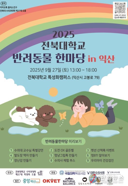익산시는 '2025 전북대학교 반려동물 한마당'이 오는 27일 오후 1시 전북대학교 익산특성화캠퍼스에서 다채롭게 펼쳐진다고 22일 밝혔다.