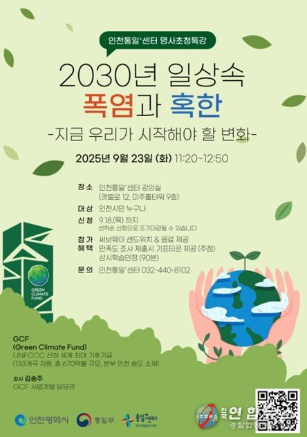 전국연합뉴스 박우배 기자 | 인천광역시는 9월 23일 인천통일플러스센터(연수구 송도동 소재)에서 녹색기후기금(GCF)의 전문가를 초청, 기후위기의 심각성과 대응방안을 주제로 하는 특별 강연을 개최했다고 밝혔다.