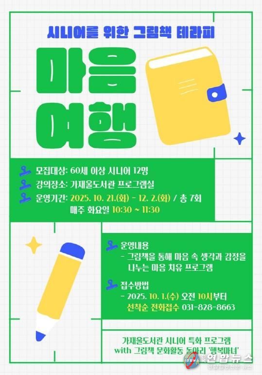 전국연합뉴스 박점규 기자 | 의정부가재울도서관은 60세 이상 노인을 위한 그림책 독서 치료 프로그램 ‘마음 여행’을 운영한다.