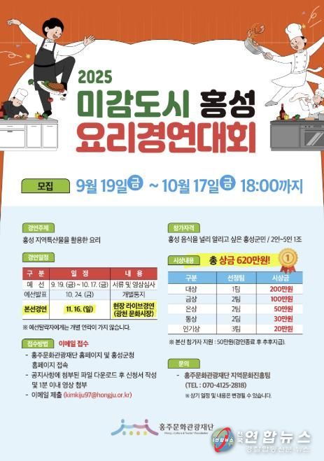 전국연합뉴스 김용태 기자 | 홍주문화관광재단은 오는 10월 17일까지 '2025년 미감도시 홍성 요리경연대회' 참가자를 공개 모집한다고 밝혔다.