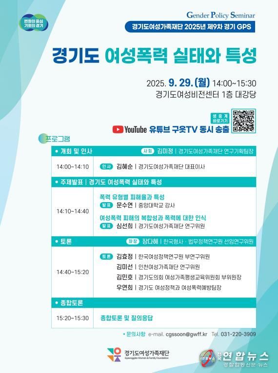 전국연합뉴스 조민준 기자 | 경기도여성가족재단은 29일 오후 2시 경기도여성비전센터 1층 대강당에서 ‘경기도 여성폭력 피해 실태와 특성’을 주제로 정책토론회를 개최한다.