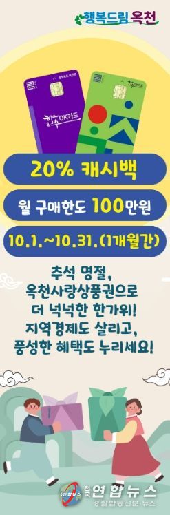 전국연합뉴스 이동수 기자 | 옥천군이 추석 명절을 맞아 군민 소비 촉진과 지역경제 활성화를 위해 오는 10월 한 달간 향수OK카드(옥천사랑상품권)의 캐시백 혜택을 기존 15%에서 20%로 상향 지원한다.