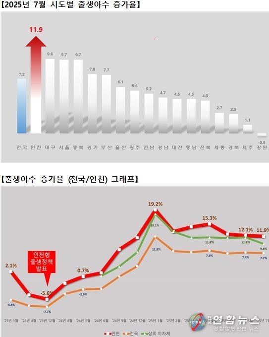 전국연합뉴스 박우배 기자 | 인천광역시는 2025년 7월 출생아 수 증가율이 전년 동기 누계 대비 11.9%를 기록하며 다시 한번 전국 1위를 차지했다고 밝혔다.