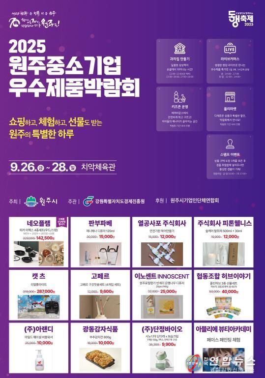 전국연합뉴스 유근택 기자 | 원주시가 주최하고 강원특별자치도경제진흥원이 주관하는 ‘2025 원주 중소기업 우수제품 박람회’가 오는 26일 오전 10시 30분, 치악체육관 무대에서 개막식을 열고 28일까지 3일간 이어지는 행사의 막을 올린다.