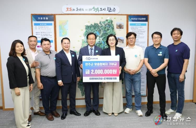 전국연합뉴스 최성용 기자 | 티앤제이건설(주)과 군계10동지회가 완주군을 찾아 후원금 200만 원을 전달했다.