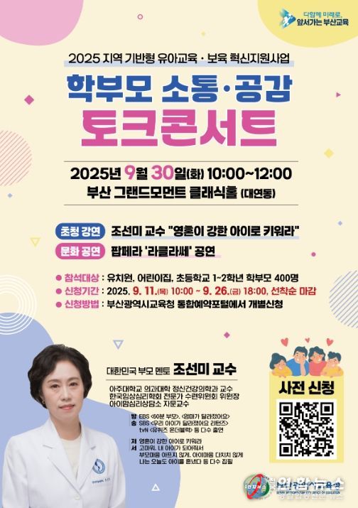 전국연합뉴스 기자 | 부산광역시교육청은 30일 남구 대연동 그랜드모먼트 클래식홀에서 관내 유치원·어린이집·초등학교(1~2학년) 학부모 400여 명을 대상으로 ‘학부모 소통·공감 토크콘서트’를 개최한다.