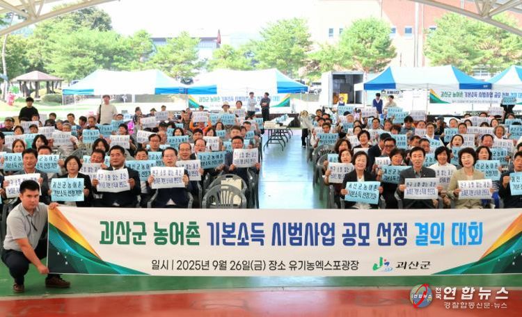 전국연합뉴스 이동수 기자 | 충북 괴산군은 26일 유기농엑스포 광장에서 열린 2025 괴산농심대제 행사에서 ‘농어촌 기본소득 시범사업’ 공모 선정을 위한 결의대회를 개최했다고 밝혔다.