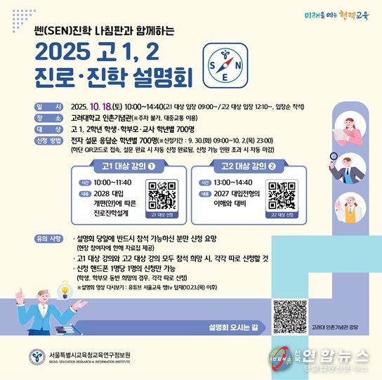 전국연합뉴스 배주현 기자 | 서울특별시교육청 산하 교육연구정보원은 2025학년도 고 1, 2 학생들의 진로·진학 학업 설계를 위한 맞춤형 통합지원을 추진하고 있다.