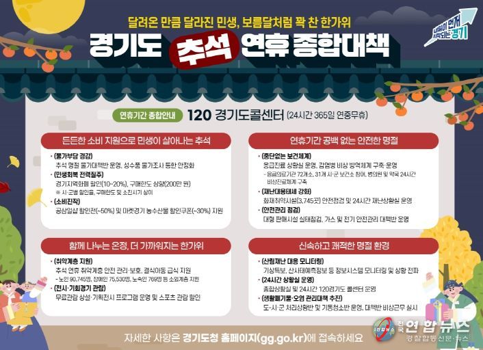 전국연합뉴스 조민준 기자 | 경기도는 도민 모두가 안전하고 넉넉한 추석을 보낼 수 있도록 10월 3일부터 10월 9일까지 7일간 ‘추석 연휴 종합대책’을 추진한다. 도는 종합상황실을 24시간 운영하고 비상근무 체계를 가동해 연휴 중 발생할 수 있는 불편과 사고에 신속 대응할 방침이다.