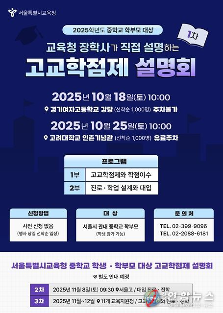전국연합뉴스 배주현 기자 | 서울시교육청은 고교학점제에 대한 이해도를 높이고 학생들의 진로·학업 설계를 돕기 위하여, 2025학년도 중학교 학부모를 위한 고교학점제 설명회를 개최한다.
