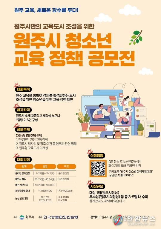 전국연합뉴스 유근택 기자 | 원주시는 지역 청소년들이 직접 제안한 정책을 바탕으로 교육도시 비전을 함께 만들기 위해 ‘원주시 청소년 교육 정책 공모전’을 추진한다.