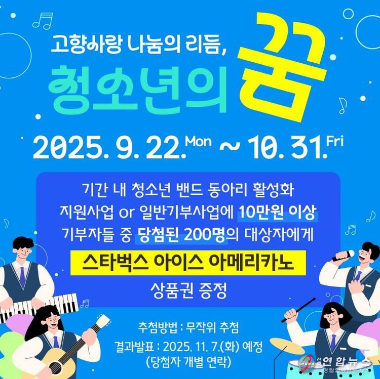 전국연합뉴스 유근택 기자 | 원주시는 많은 시민들에게 고향사랑기부제 지정기부사업인 ‘청소년밴드 동아리 활성화 지원사업’을 알리고 고향사랑기부제 참여를 독려하기 위해 커피 쿠폰 제공 이벤트를 실시한다.