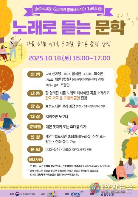 전국연합뉴스 박말출 기자 | 인천 계양구 효성도서관은 오는 10월 18일 오후 4시, 효성도서관 야외 마당에서 지역 주민과 함께하는 특별 프로그램 ‘노래로 듣는 문학’을 운영한다.