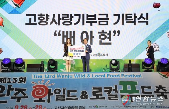 전국연합뉴스 최성용 기자 | 완주군 고향사랑기부제 홍보대사인 트로트 가수 배아현 씨가 지난 26일 완주 와일드&로컬푸드축제 현장에서 기탁식을 열고 200만 원을 기부하며 따뜻한 나눔을 실천했다.
