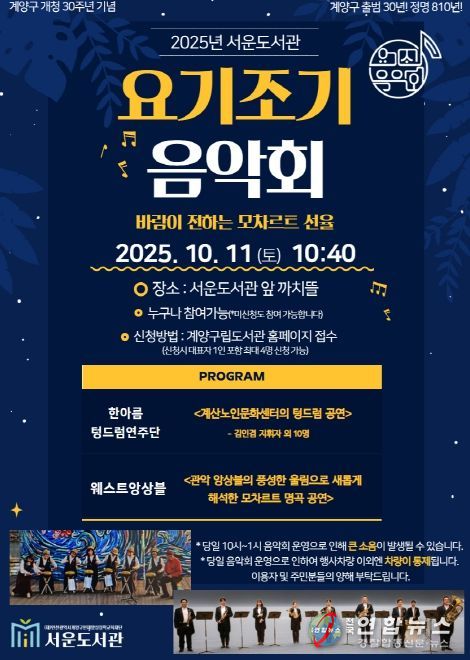전국연합뉴스 박말출 기자 | 인천 계양구 서운도서관은 오는 10월 11일 오전 10시 40분, 서운도서관 야외공원(까치뜰)에서 요기조기 음악회 ‘바람이 전하는 모차르트 선율’을 개최한다.