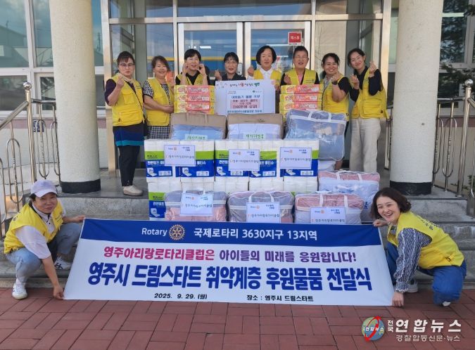 전국연합뉴스 김삿갓 기자 | 영주아리랑로타리클럽(회장 안외숙)이 추석을 맞이하여 29일 영주시드림스타트에 이불·화장지·컵라면등 100만 원 상당의 물품을 전달했다.