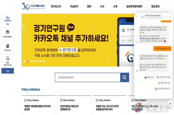 전국연합뉴스 조민준 기자 | 경기연구원은 연구원의 정책자료를 보다 쉽고 편리하게 활용할 수 있도록 홈페이지에 인공지능(AI) 기반 검색 챗봇 서비스를 정식 운영한다고 30일 밝혔다.