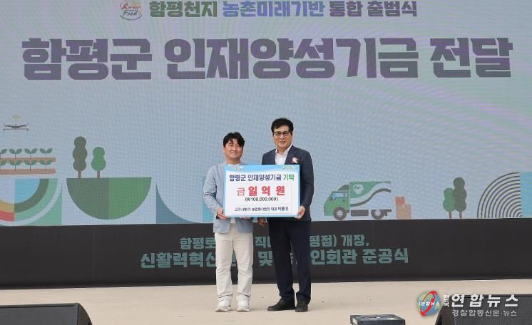 함평군은 30일 “고기사랑(주) 농업회사법인 및 함평축산물종합처리장 이동우 대표가 지난 26일 함평자동차극장에서 개최된 ‘함평천지 농촌미래기반 통합 출범식’ 행사 중 인재양성기금에 1억 원을 쾌척했다”고 밝혔다.