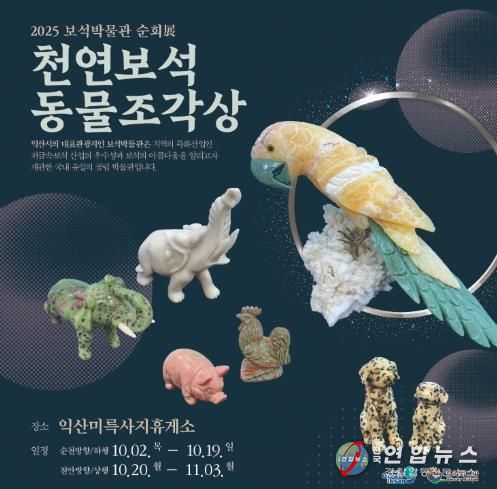 전국연합뉴스 최성용 기자 | 익산시 보석박물관은 추석 연휴가 시작되는 10월 2일부터 11월 3일까지 익산미륵사지휴게소(양방향)에서 '천연보석 동물조각상' 순회전시를 진행한다.