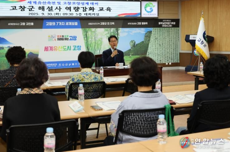 전국연합뉴스 최성용 기자 | 고창군이 30일 군청 5층 회의실에서 ‘2025 세계유산축전(10월2~22일)’과 ‘제52회 고창모양성제(10월29일~11월2일)’를 앞두고 해설사 친절교육을 실시했다.