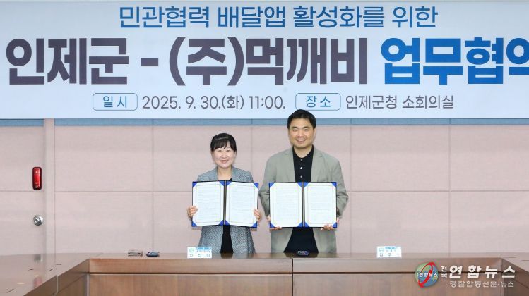 전국연합뉴스 신승국 기자 | 인제군은 9월 30일 군청 소회의실에서 민관협력 배달앱 ‘먹깨비’ 운영사와 업무 협약을 체결하고, 지역 소상공인 경영 안정과 군민 편익 증진을 위한 본격적인 협력에 나섰다.