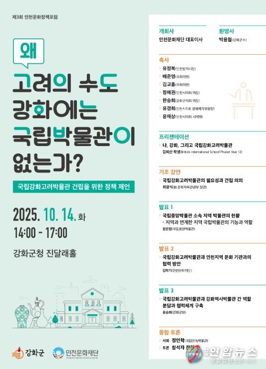 전국연합뉴스 고기남 기자 | 강화군은 오는 14일 강화군청에서 ‘고려의 수도 강화에는 국립박물관이 없는가?’를 주제로 정책 포럼을 개최한다고 밝혔다.