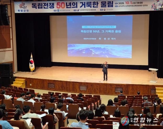 전국연합뉴스 기자 | 광주시교육청은 1일 학생교육문화회관 공연장에서 광복 80주년을 맞아 인문학 강연 ‘독립운동 50년의 거룩한 울림’을 진행했다.