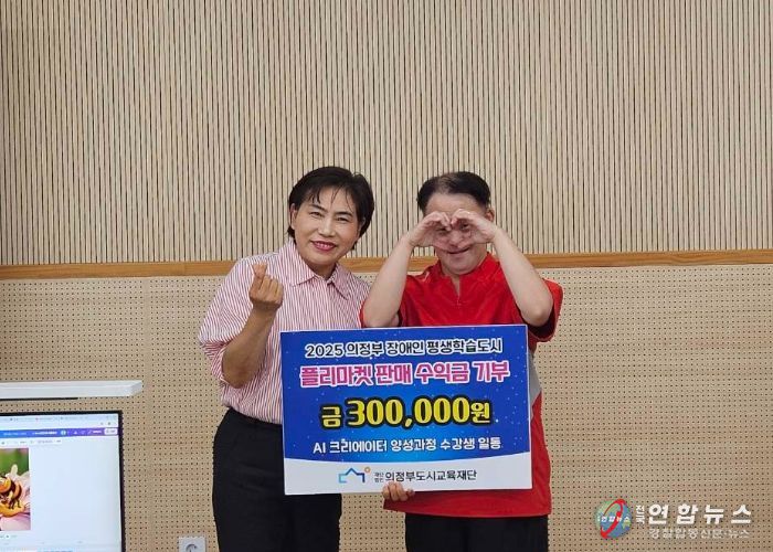 전국연합뉴스 박점규 기자 | 의정부도시교육재단은 장애인평생학습도시 사업의 일환으로 운영된 'AI 크리에이터 양성과정' 장애인 수강생들이 직접 제작한 상품 판매 수익금을 지역사회에 기부했다고 30일 밝혔다.