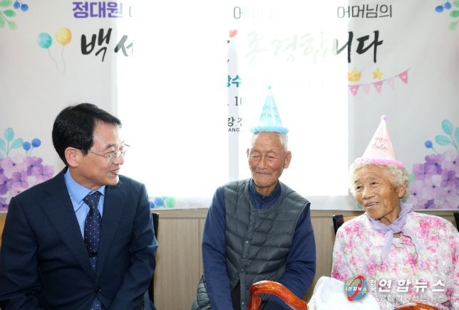 이날 100세 어르신께 드리는 청려장과 함께 과일·참치세트 등 위문품을 전달했으며, 케이크 커팅과 기념촬영을 통해 참석자 모두가 어르신들의 장수를 축하하는 시간을 가졌다.