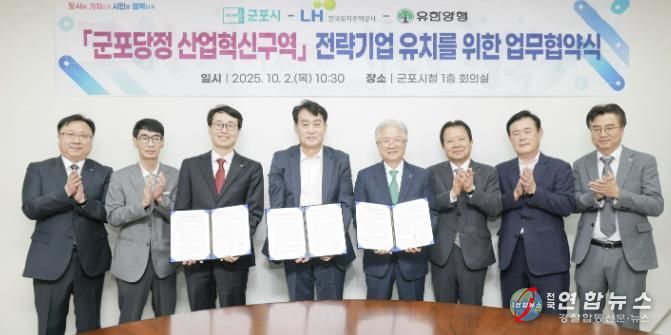 전국연합뉴스 김홍진 기자 | 군포시는 2일 군포시청에서 한국토지주택공사(LH), ㈜유한양행과 ‘군포당정 산업혁신구역’ R·D 전략기업 유치를 위한 업무협약을 체결했다고 밝혔다.